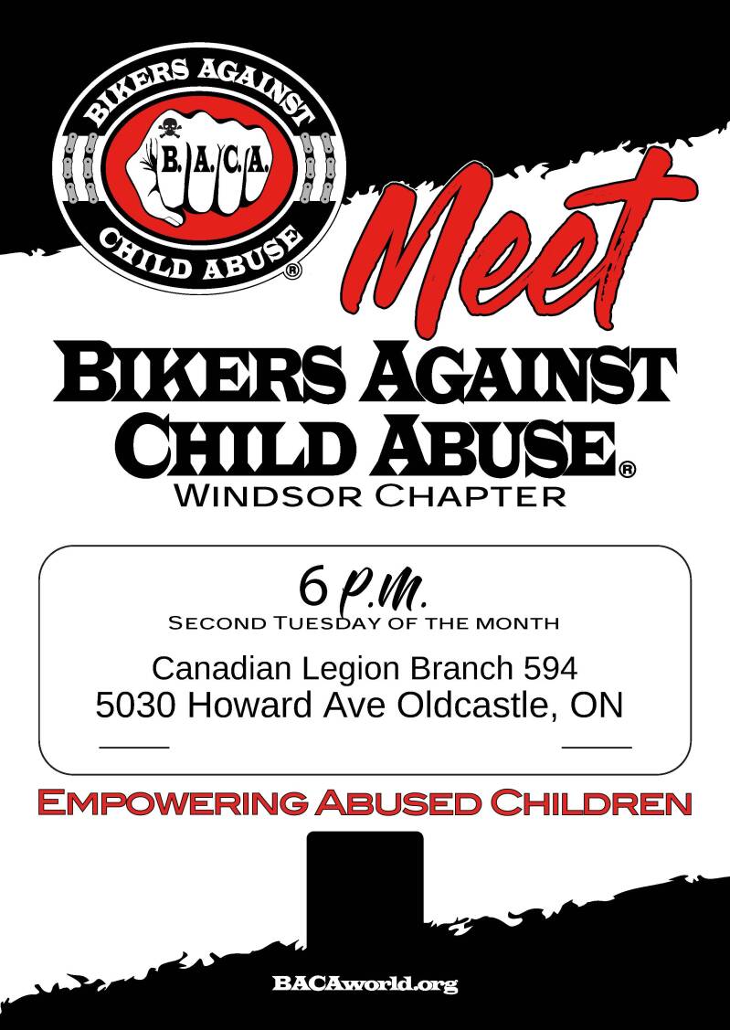 Bikers Against Child Abuse, Inc. (B.A.C.A.) exists with the intent to create a safer environment for abused children. We exist as a body of Bikers to empower children to not feel afraid of the world in which they live. We stand ready to lend support to our wounded friends by involving them with an established, united organization.